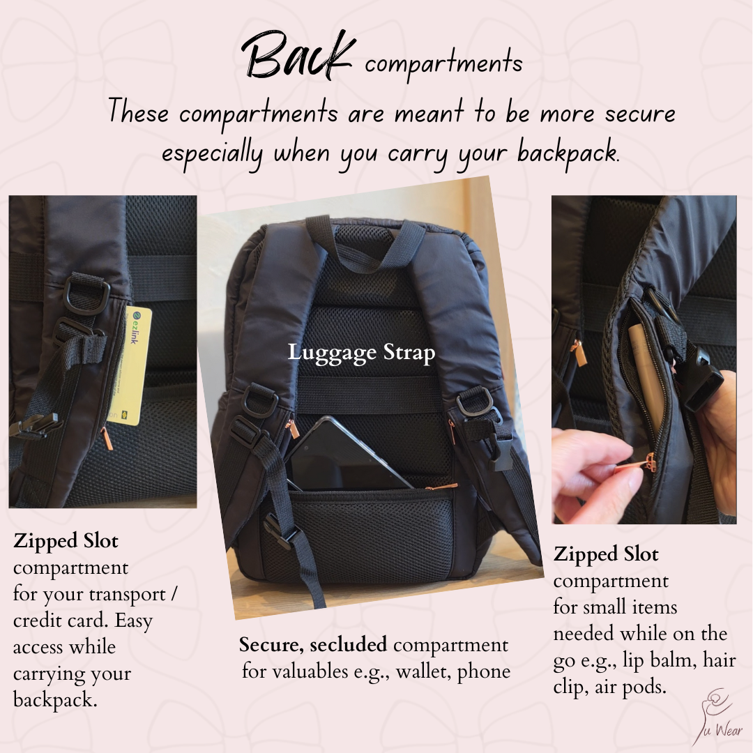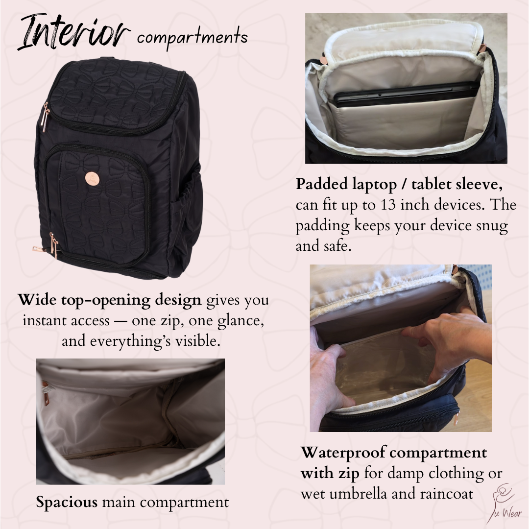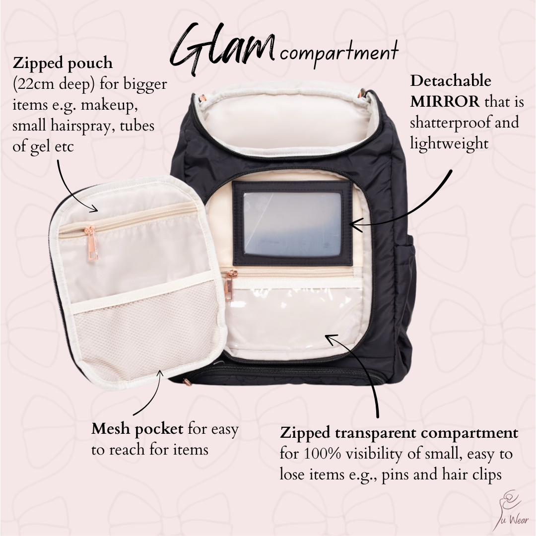 Never before seen in a backpack — the on-the-go Glam Compartment is a dream for performers, professionals, and multitasking mums.