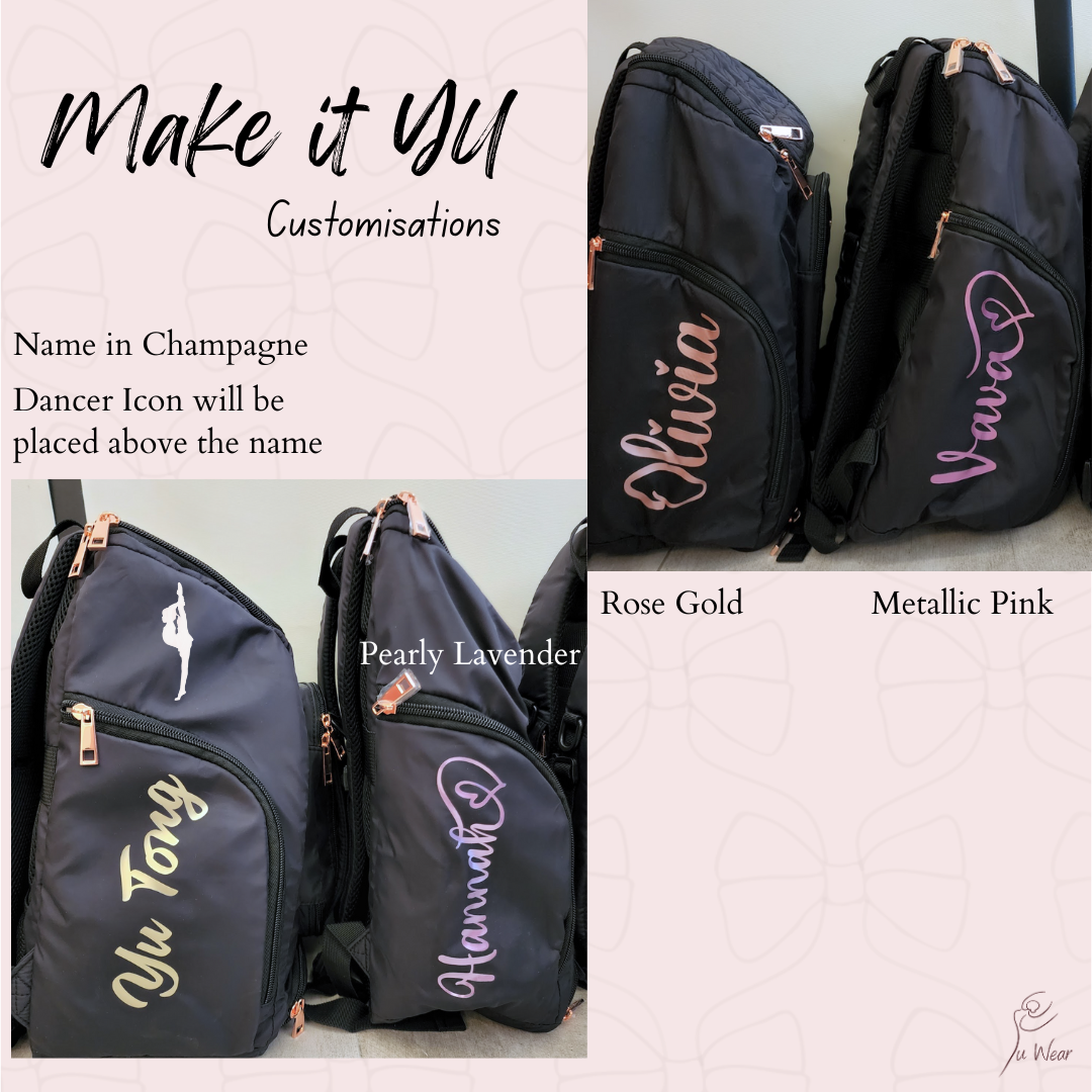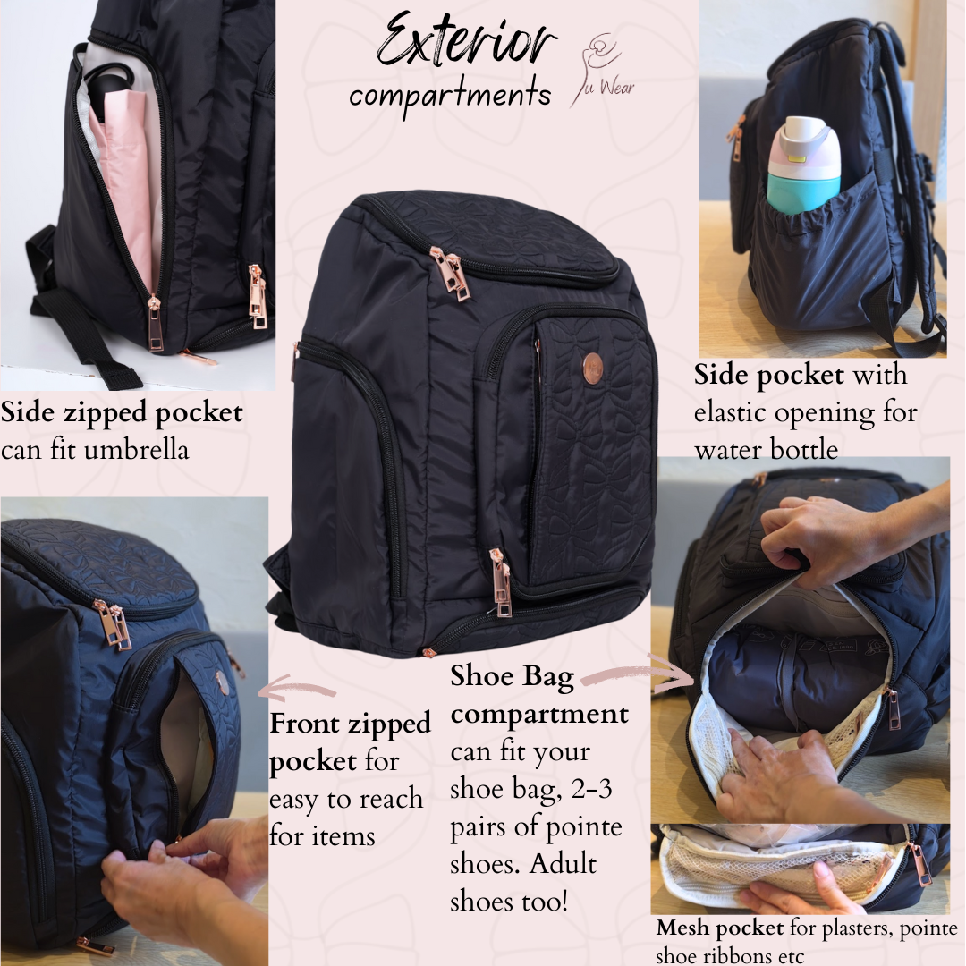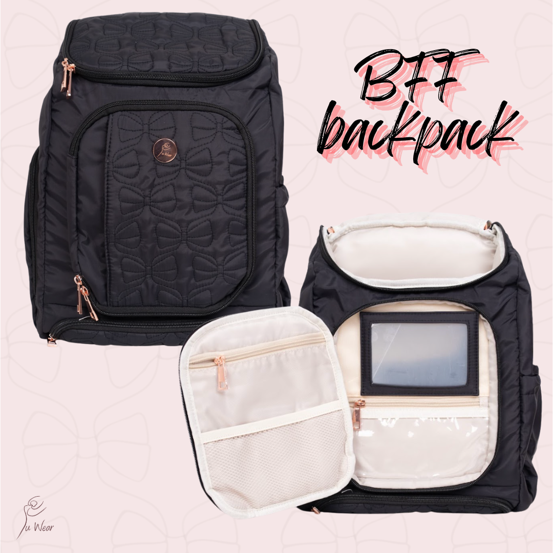 The backpack that gets you, exclusively designed by Yu Wear — thoughtfully designed to be your go-to for every part of your day. Whether you're heading to school, the studio, or running errands, the BFF has 15 intelligently designed compartments, more than any other dance bag on the market. The bag is finished with luxurious rose gold zippers and crafted from sturdy, water resistant material. This bag is built to last.