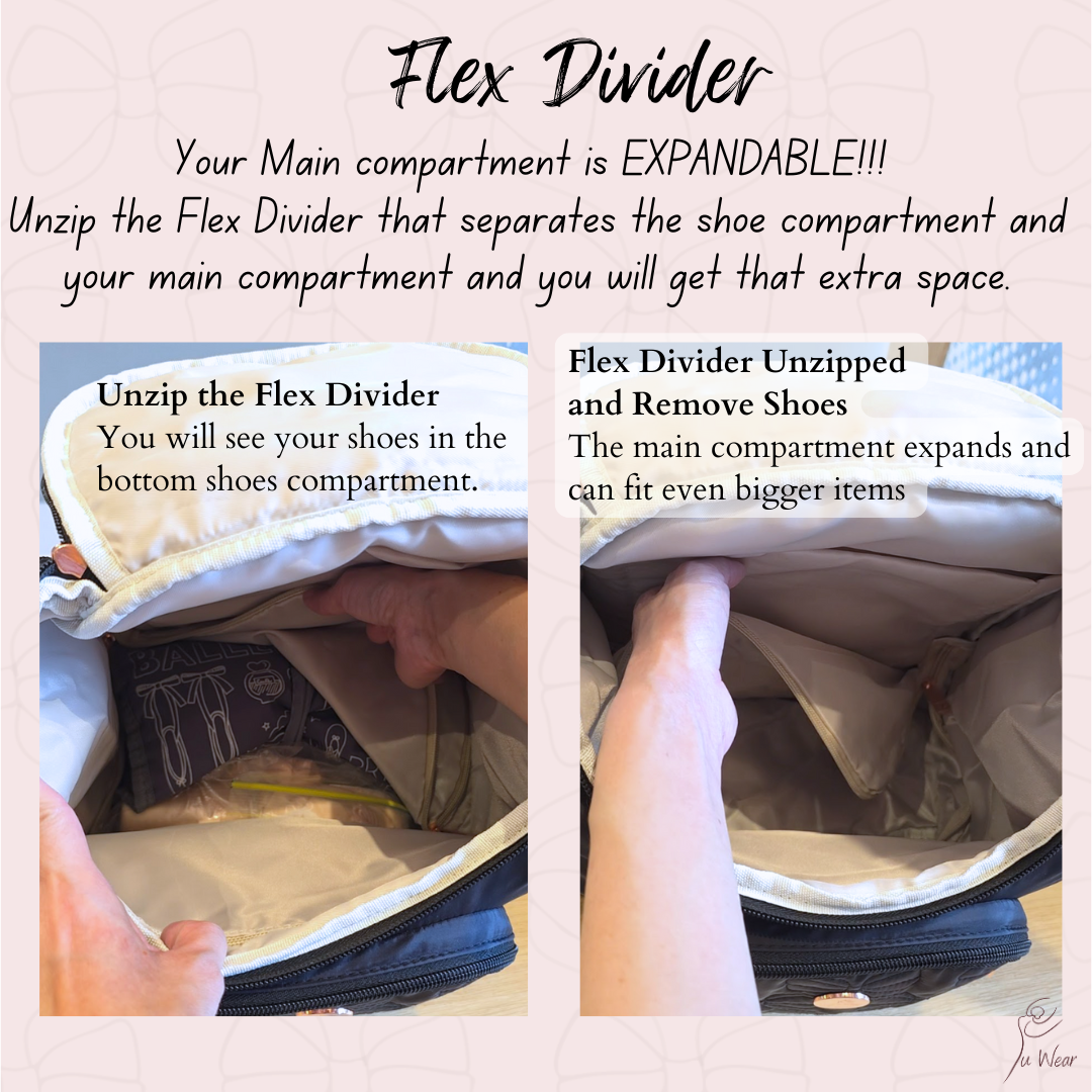- Dedicated Shoe Compartment: Holds 1 bulky shoe bag or 3-4 pairs of pointe shoes or even adult footwear.